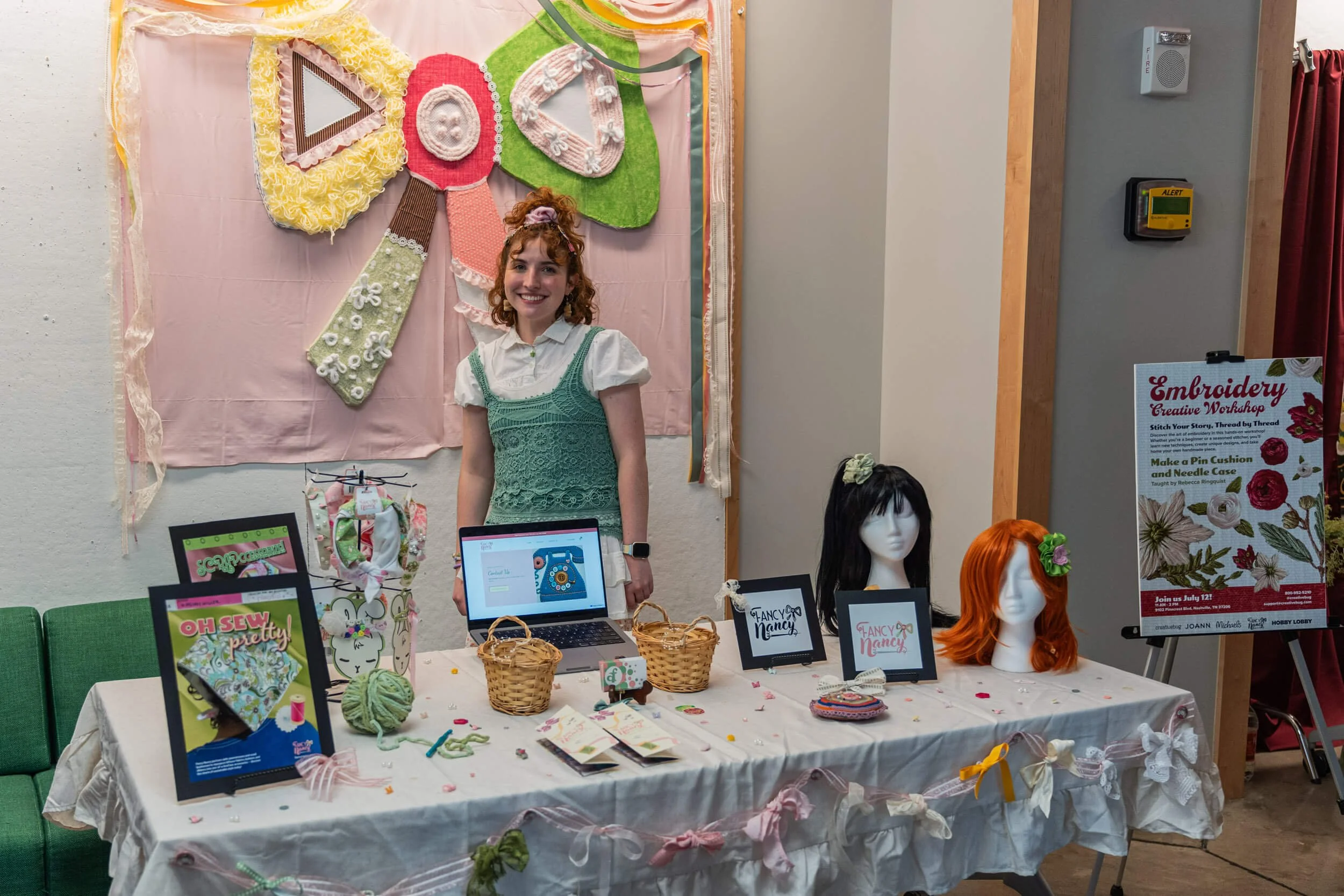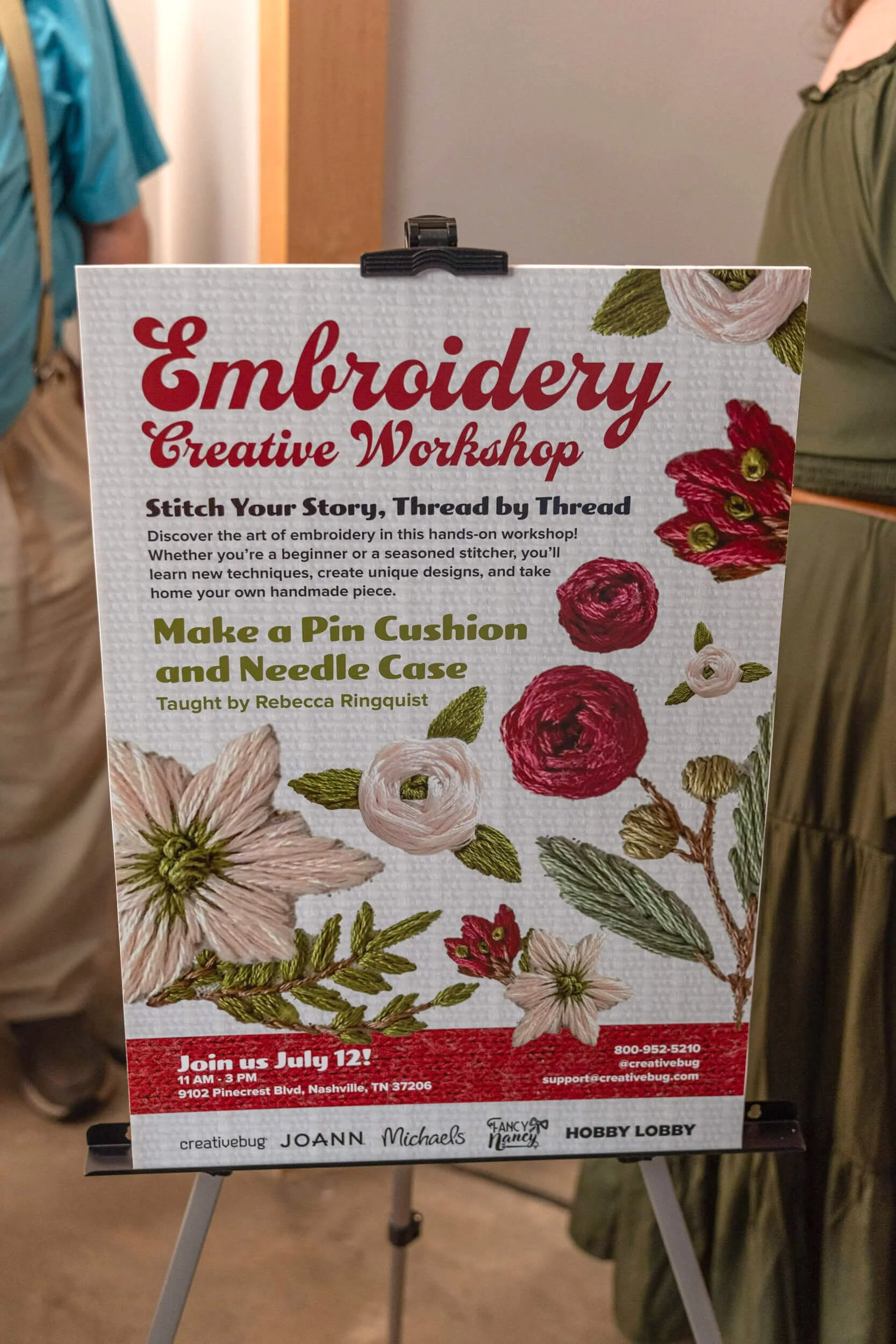 Imagery ties in with sewing concept with a textured background and embroidery for the workshop