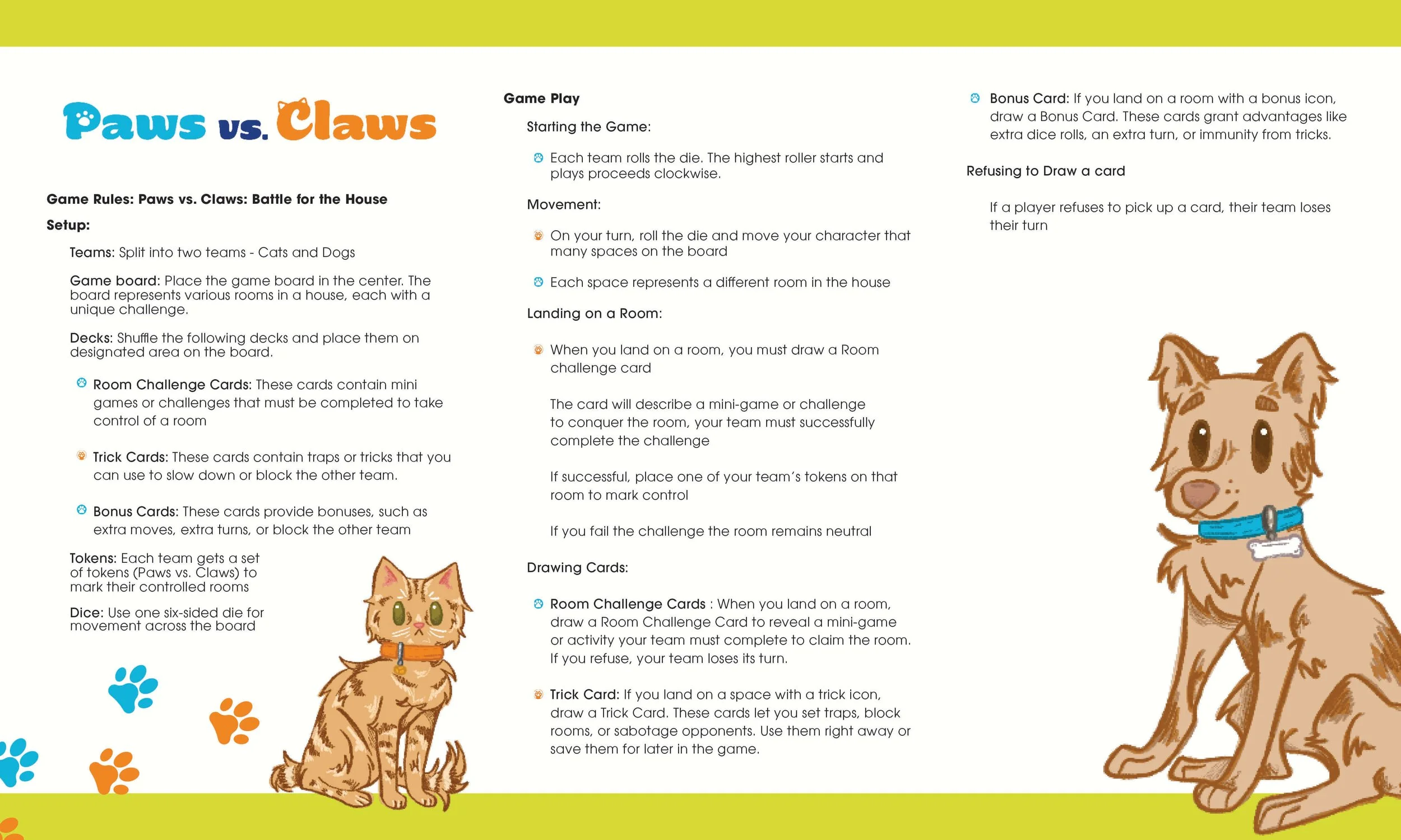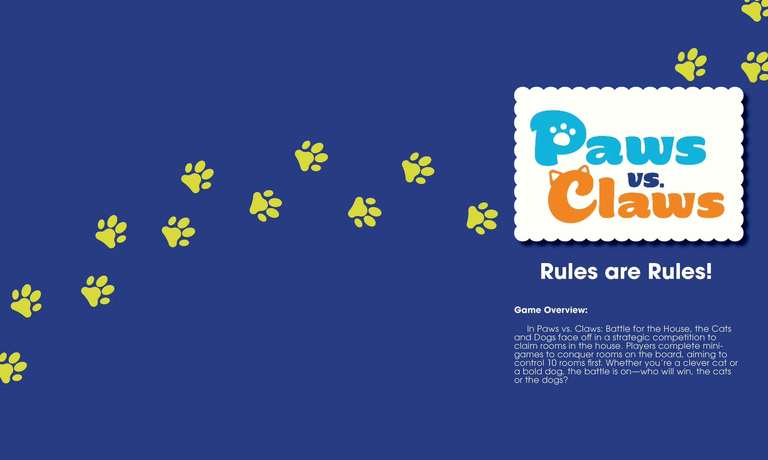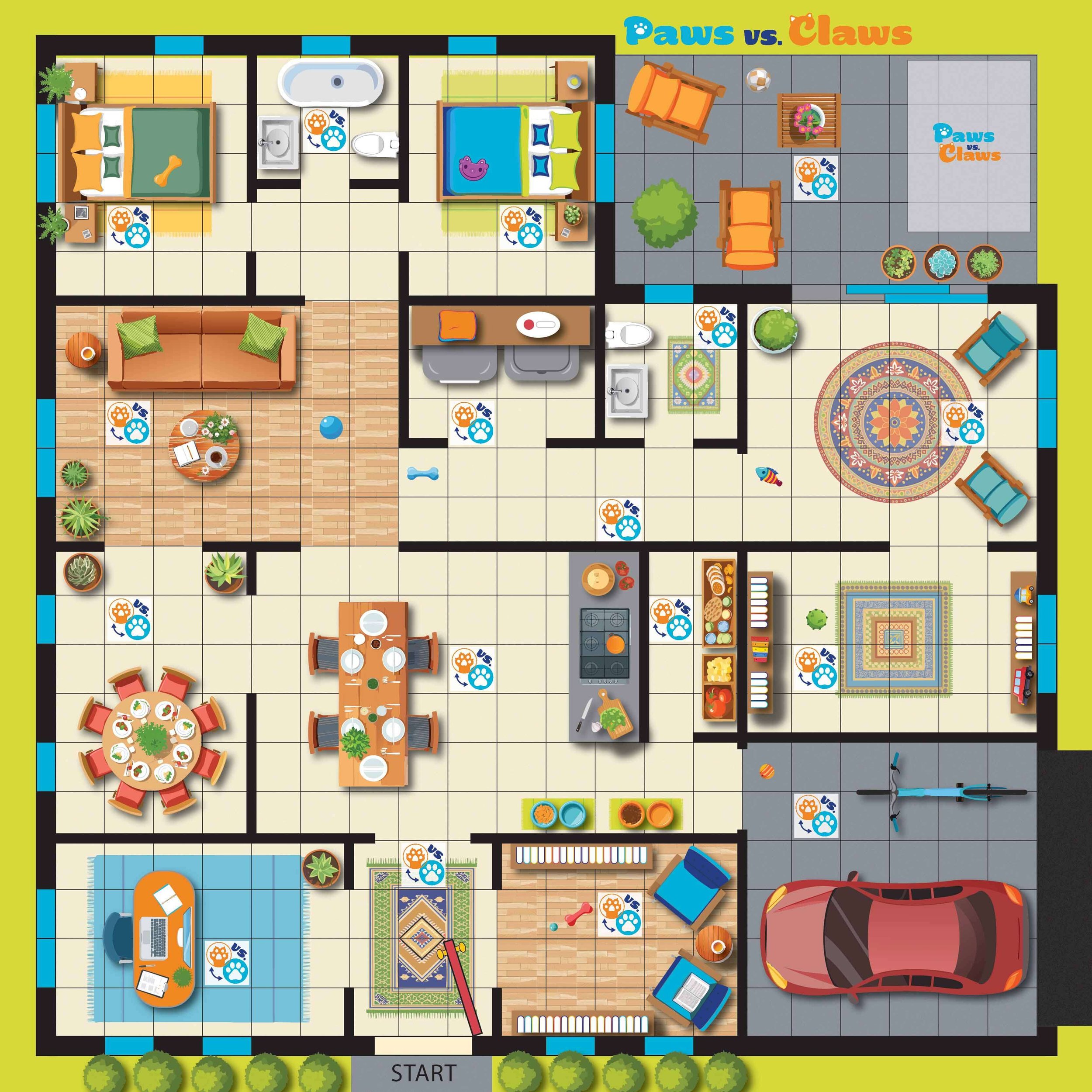 In Paws vs Claws: Battle for the House, the Cats and Dogs face off in a strategic competition to claim rooms in the house. Players complete mini games to conquer rooms on the board, aiming to control 10 rooms first. Whether you’re a clever cat or a bold dog, the battle is on!